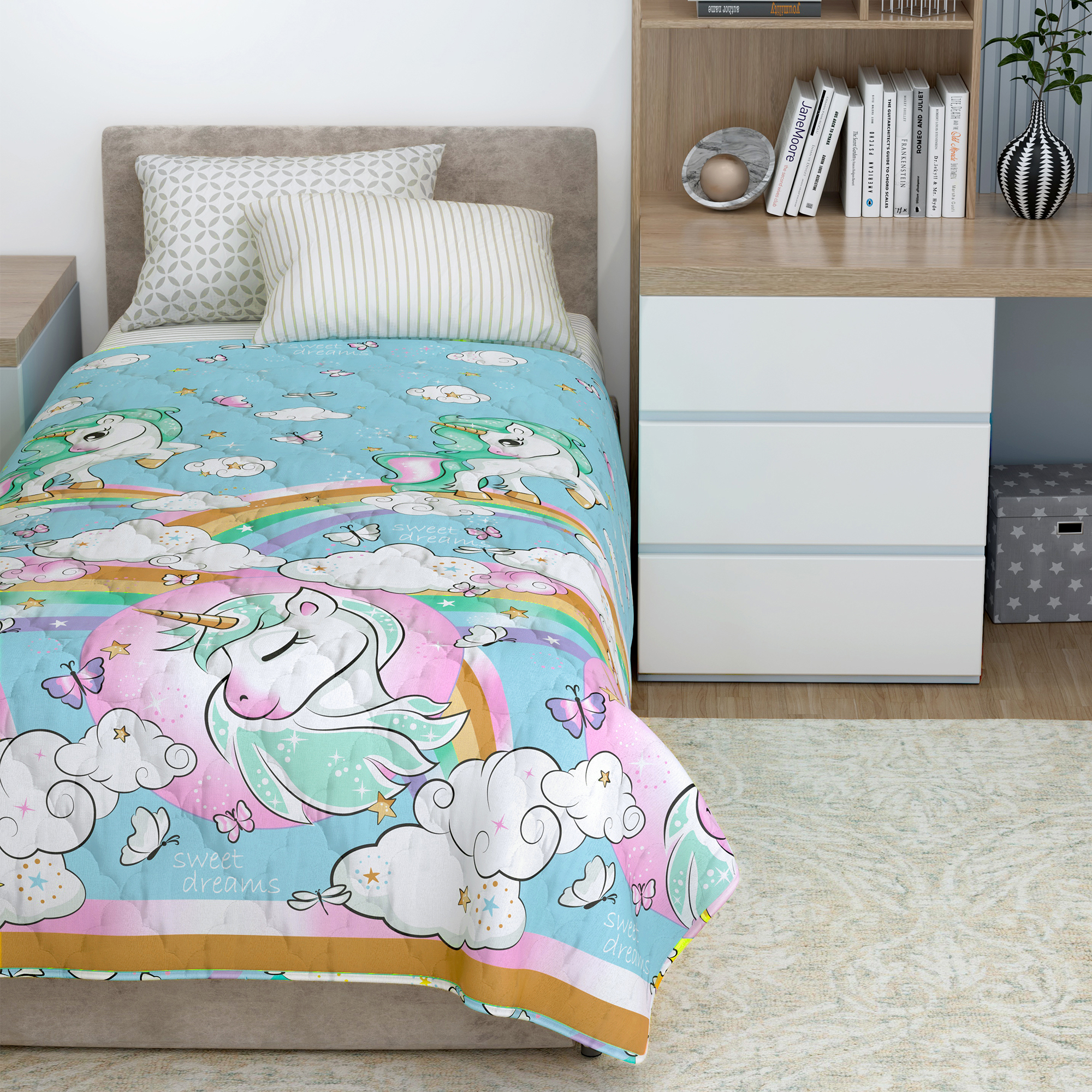 Покрывало "Rainbow unicorn" подарит вам тепло, комфорт и уют! В этот комплект многие влюбятся с первого взгляда! Постельное белье выполнено из материала Поплин – ткань, располагающая к комфортному и приятному сну.